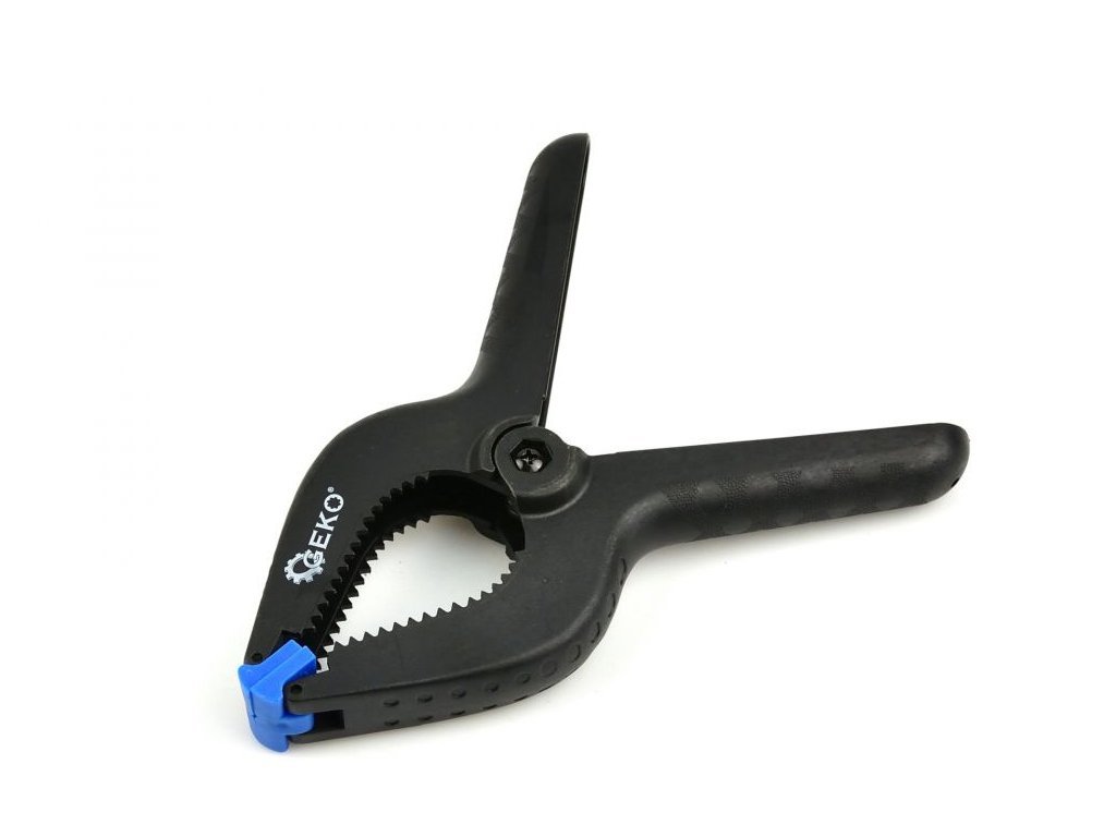 Pružinová svěrka 200mm z odolného plastu, vybavená silnou ocelovou pružinou a výkyvnými čelistmi přizpůsobujícími se lisovanému povrchu. Ideální například pro lepení různých typů prvků.