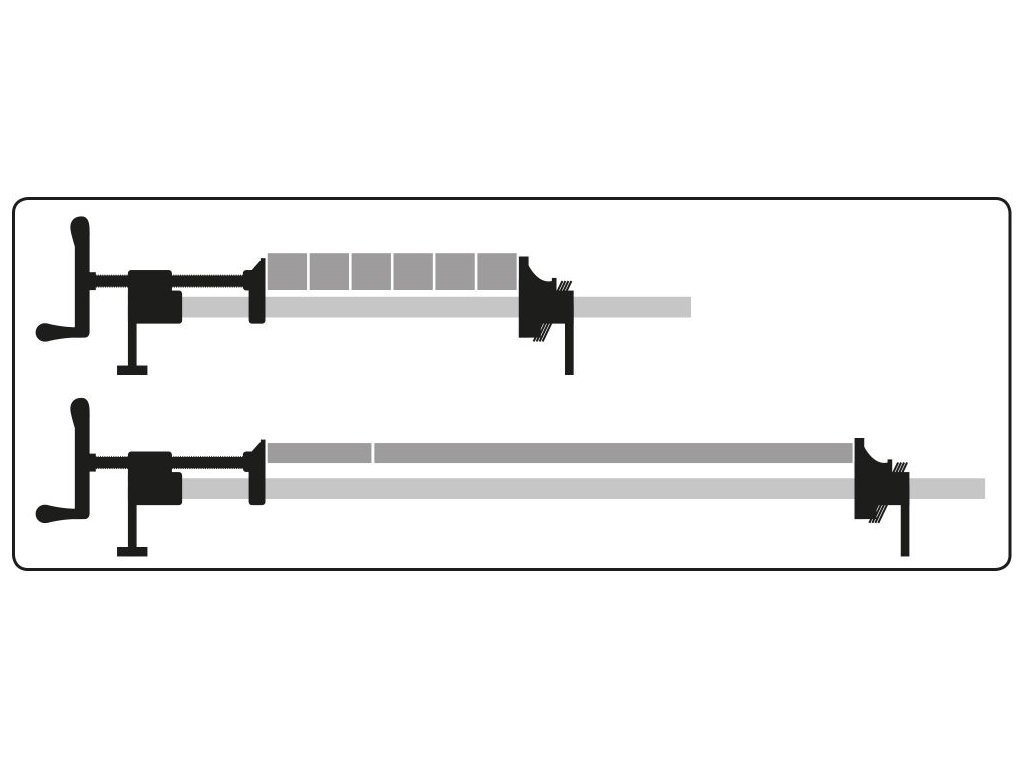 - délku svěrky lze nastavovat použitím libovolné délky 3/4" trubky (doporučená tl. stěny trubky min. 2,4mm); na jeden konec trubky je nutno vyřezat vnější závit (DN 20) a tuto část zafixovat do pevného konce svěrky, zatímco druhá část svěrky je posuvná/nastavitelná a její pozici na trubce měníme za pomocí pružinové aretace