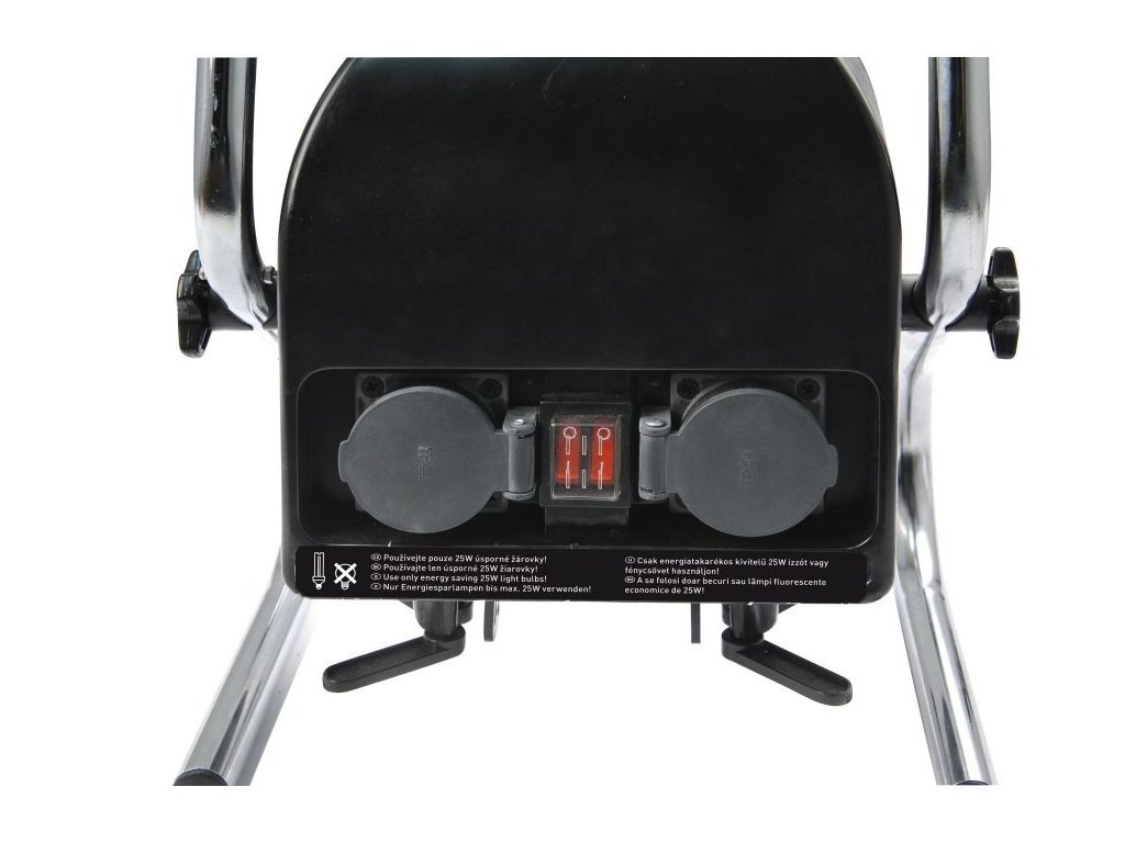 - doplňující parametr: 3 úsporné žárovky se závitem E27, 3 stupně svítivosti: 24W (=120W)-36W (=180W)-60W (=300W), napájení 230V~50Hz, délka kabelu 2m, 2 zásuvky 230V/16A na zadní straně světla, krytí světla IP44, zásuvek IP54