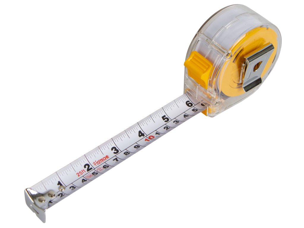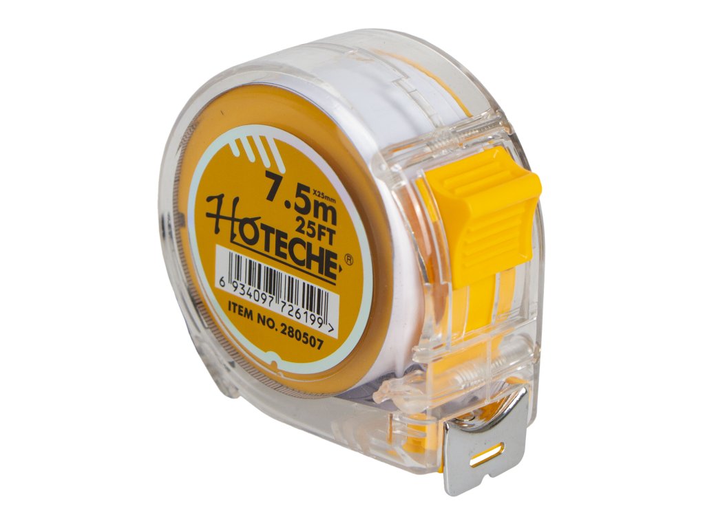Profesionální průhledný svinovací metr dlouhý 7,5 m s šířkou 25 mm. Obal metru je vyroben z průhledného PC plastu a svinovací pás z uhlíkové oceli.