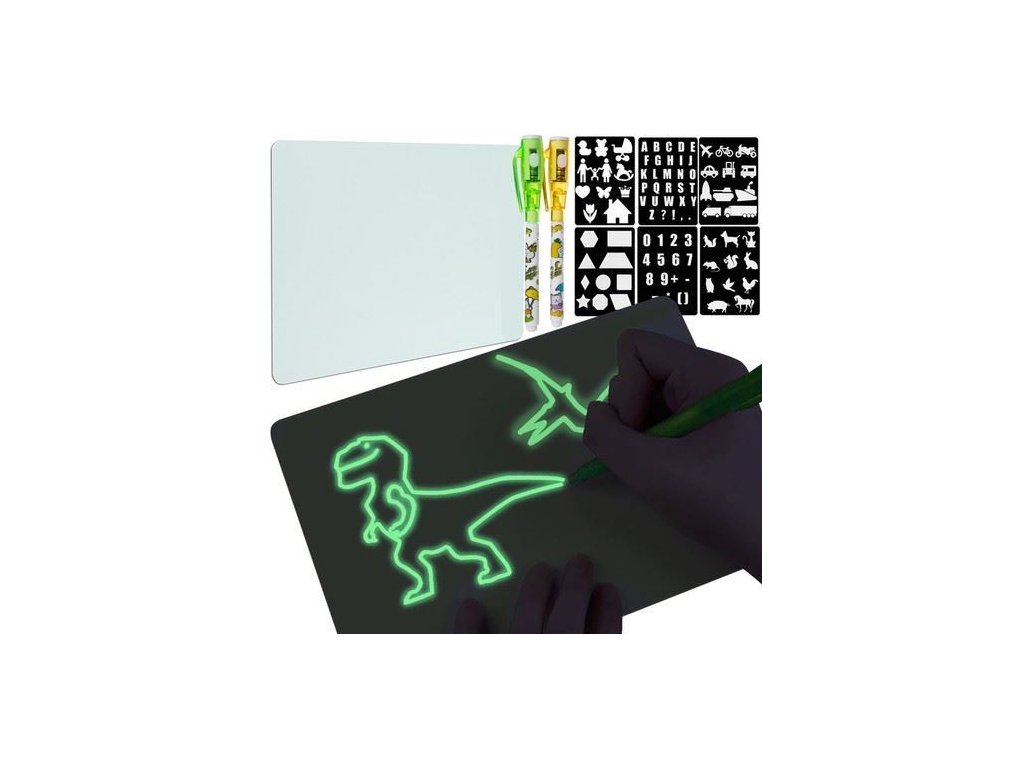 Svítící tabule na kreslení GlowTab A4 Svítící zábava pro vaše děti, se kterou bude učení koordinace rukou kouzelnou zkušeností! Magic Drawing Board je speciální svítící tabule na kreslení, na které můžete pomocí speciálních per vytvářet zářivé motivy, pak je můžete setřít a začít znovu. Nádherná didaktická hračka pro vaše mrňouse. Sada obsahuje dvě pera a několik šablon na obkreslování. Pera se dají použít i na papír jako psaní tajnýminkoustem.Pamatujete si na nejcennější chvilky ze svého dětství? Určitě k nim patří intimní chvilky těsně před usnutím, když vám rodiče četli pohádky. Nyní můžete svému mrňousovi tyto drahocennéchvilky zpestřit kresbami na svítící tabuli. Zatemněte pokojíček a při vyprávění pohádky přeneste příběh na svítící tabuli. Tyto drahocenné momenty se určitě děťátku vryjí navždy do paměti. I hra se sourozenci se stane pohádkovým zážitkem.'