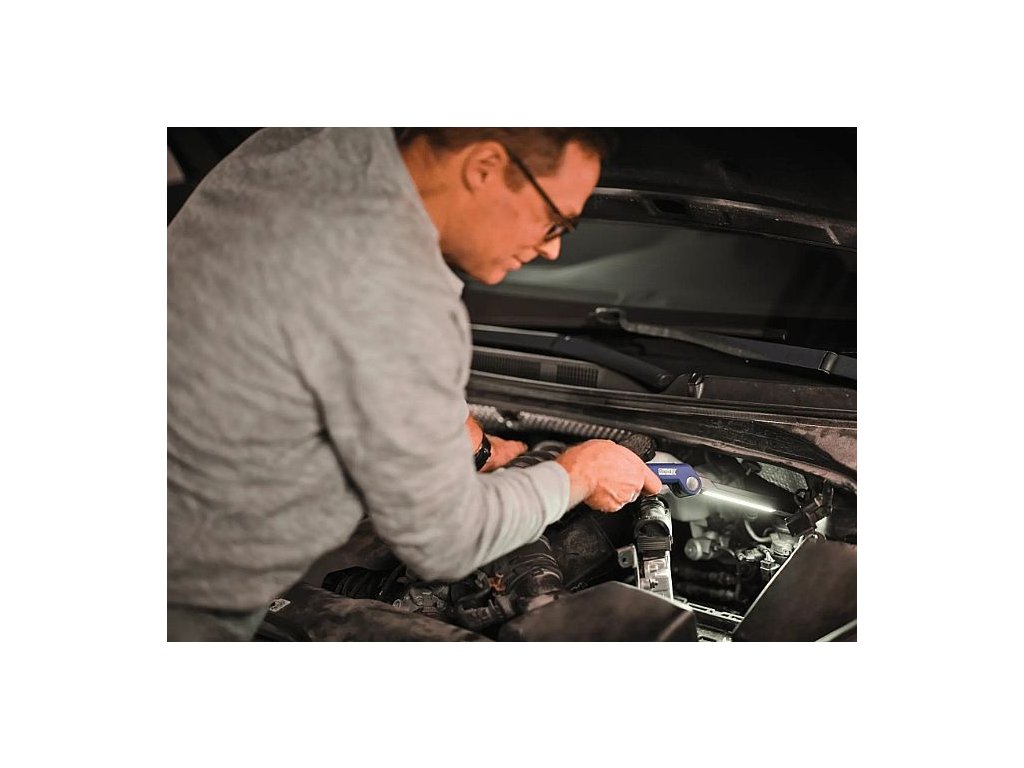Dlouhé rameno svítilny Mechanic se vyklápí a poskytuje všestranné pracovní osvětlení shora i z boku s jasem 500 lumenů na boku