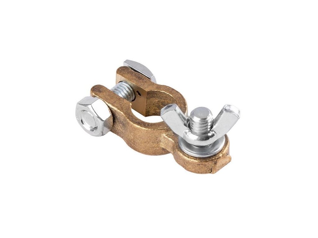 Mosazná svorka baterie 1ks s motýlkem místo šroubu, svorka pro autobaterii s napětím do 12V.Svorky jsou vyrobeny z mosazi, díky čemuž dobře vedou elektrický proud a nekorodují.