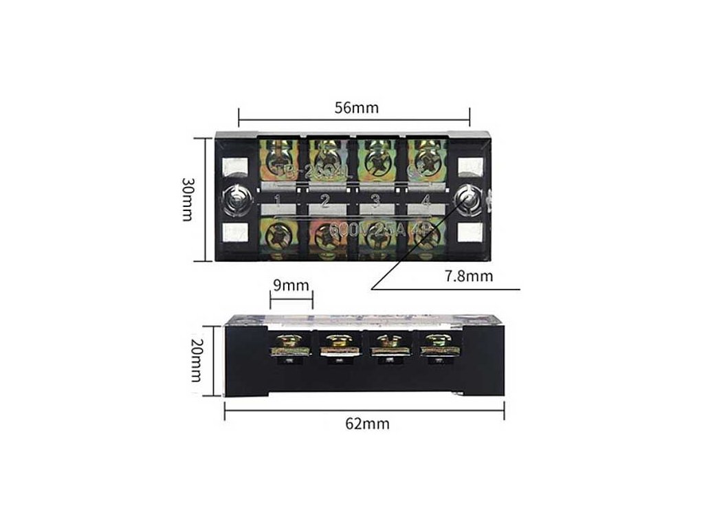 Svorkovnice TB-2504 4x6mm2 600V/25A, 4póly, 8x šroub M4, rozměry: 62,5x30x20mmDoplňkové parametry