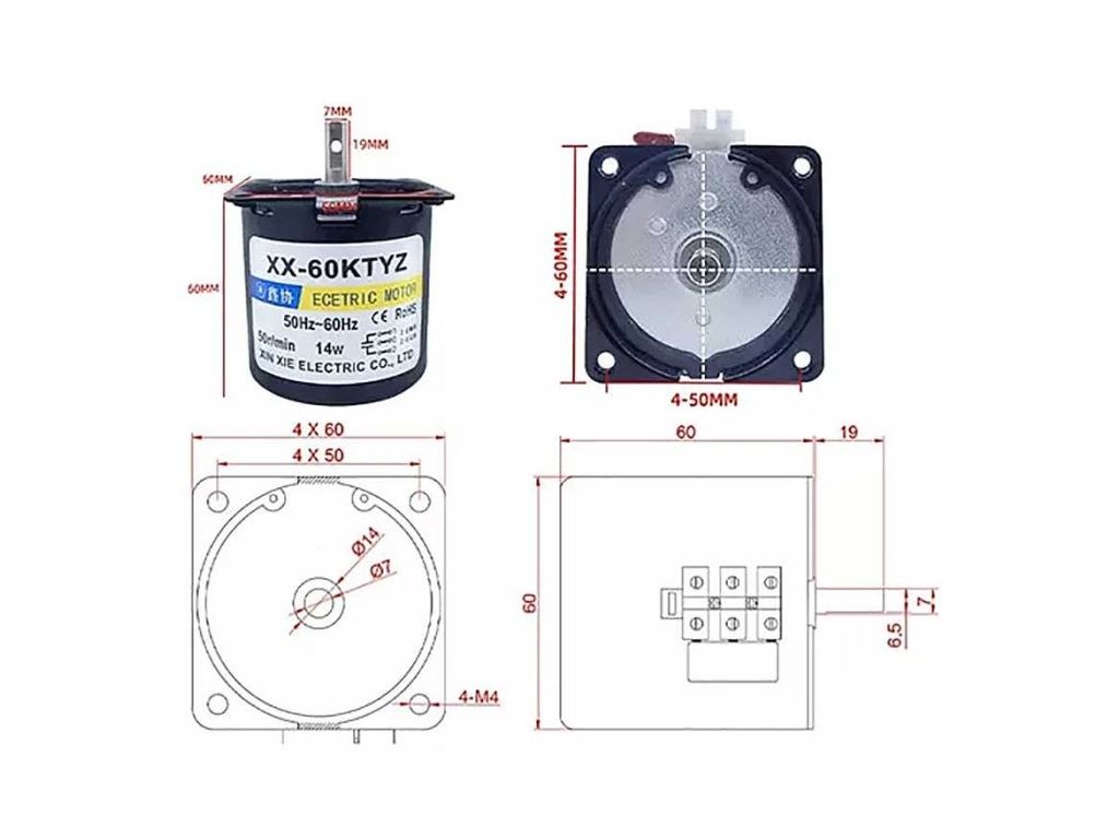 Synchronní motorek 60KTYZ, 230V~ 14W s převodovkou, 10RPM Synchronní motor s pernamentním magnetem a převodovkou s možností změny otáček**Specifikace:**