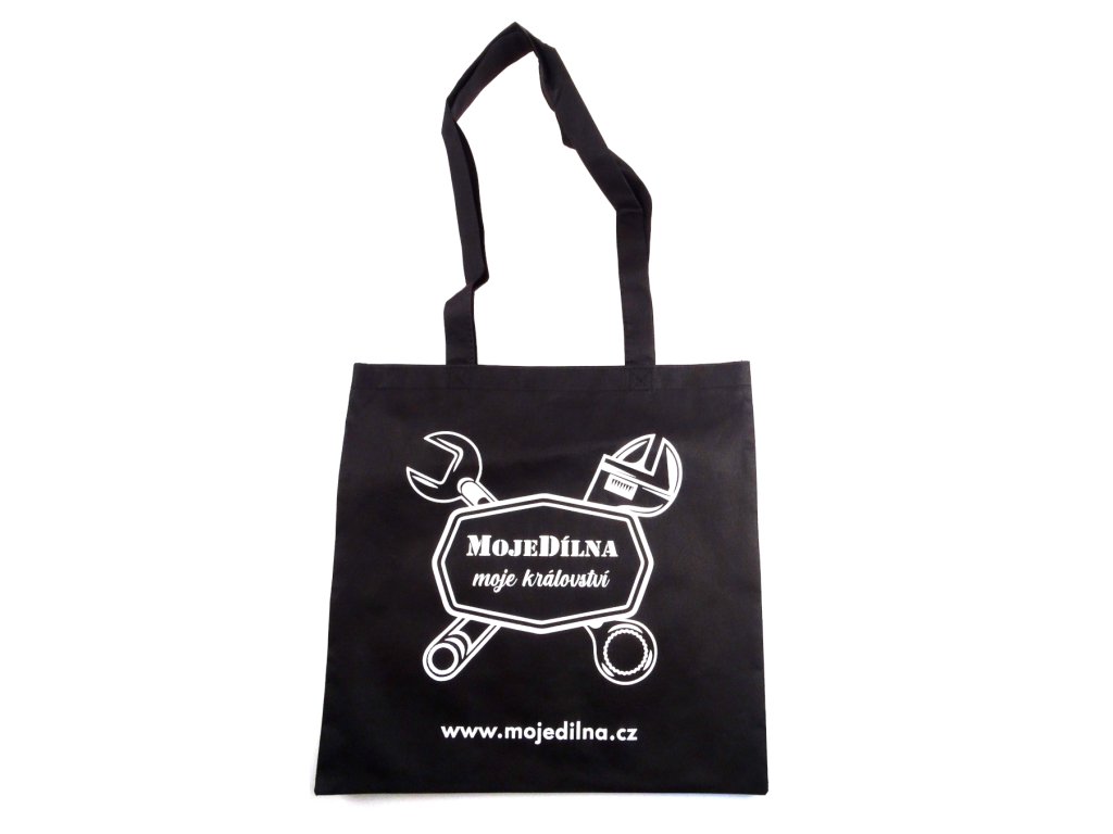 Taška textilní s uchem, netkaná textílie, černá "MojeDílna moje království" (MojeDílna.cz)