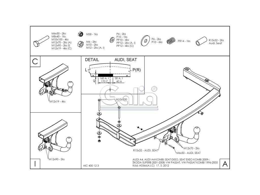 Tažné zařízení Audi A4 Avant (kombi) 2001-2004 (B6), pevný čep 2 šrouby, Galia