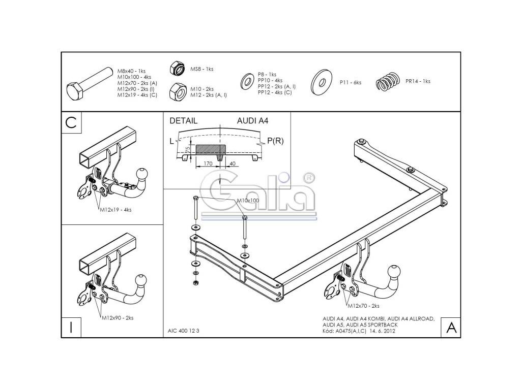 Tažné zařízení Audi A5 Coupé 2008-2017 (8T3), pevné 2š, Galia Tažné zařízení Audi A4 4dv., kombi / Allroad / A5 Coupé, Sportback Poznámka: model Audi A5 Coupé /Sportback - připravuje se KVALITNÍ TAŽNÉ ZAŘÍZENÍ, KTERÉ NEREZAVÍ, ZA NEJLEPŠÍ CENU + Tažné zařízení největšího slovenského výrobce má unikátní povrchovou úpravu zinkováním s 10-ti letou zárukou na ochranu proti korozi. Zinkování vytváří stříbrný povrch, který se po čase vlivem oxidace změní na šedý odstín. Přesnou sériovou výrobou na nejmodernějších strojích je zaručena snadná a rychlá montáž na vozidlo a dobrá cena. Tažné zařízení je homologováno dle předpisu ECE 55R nebo EU94/20. Výrobce: GALIA Slovakia s.r.o., SlovenskoDoplňkové parametry