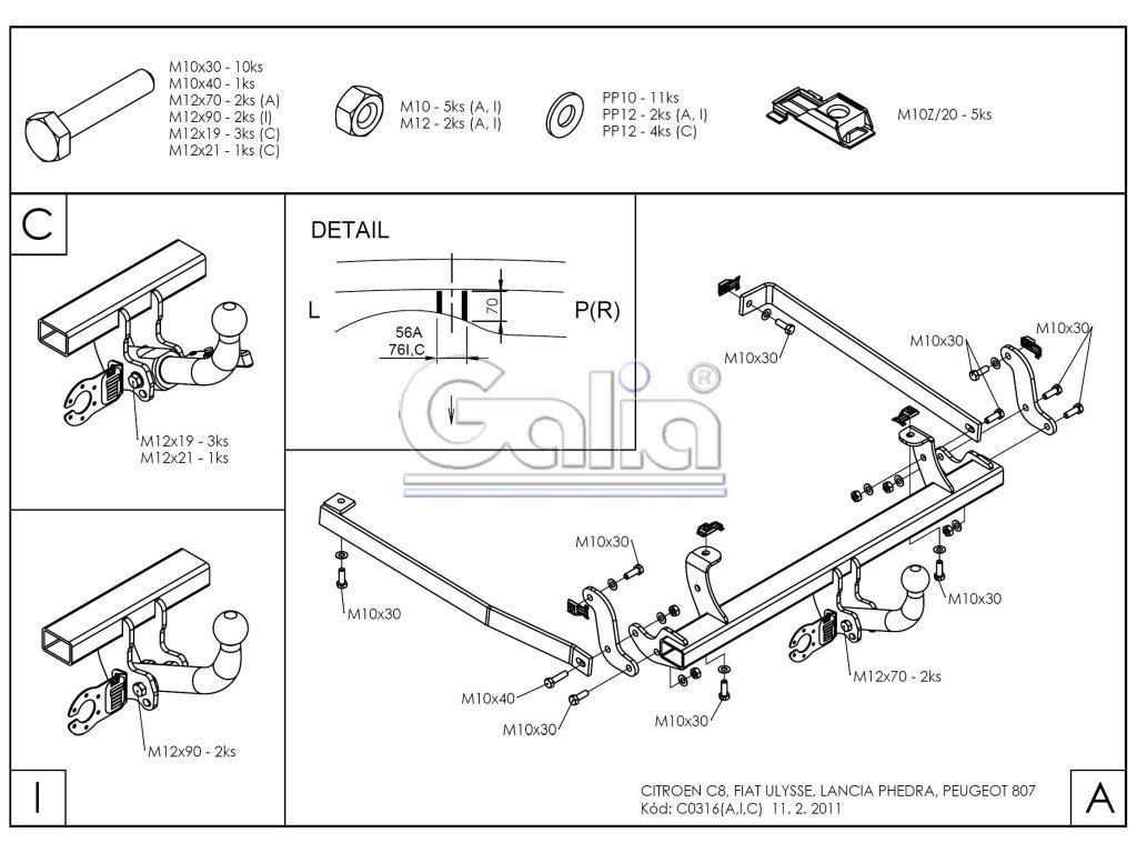 Tažné zařízení Citroen C8 2002-, pevný čep 2 šrouby, Galia Tažné zařízení Citroen C8 / Peugeot 807 CITROEN C8 (2002 - 2011) FIAT Ulysse (2002 - 2010) LANCIA Phedra (2002 - 2010) PEUGEOT 807 (2002 - 2011) + KVALITNÍ TAŽNÉ ZAŘÍZENÍ, KTERÉ NEREZAVÍ, ZA NEJLEPŠÍ CENU + Tažné zařízení největšího slovenského výrobce má unikátní povrchovou úpravu zinkováním s 10-ti letou zárukou na ochranu proti korozi. Zinkování vytváří stříbrný povrch, který se po čase vlivem oxidace změní na šedý odstín. Přesnou sériovou výrobou na nejmodernějších strojích je zaručena snadná a rychlá montáž na vozidlo a dobrá cena. Tažné zařízení je homologováno dle předpisu ECE 55R nebo EU94/20. Výrobce: GALIA Slovakia s.r.o., SlovenskoDoplňkové parametry