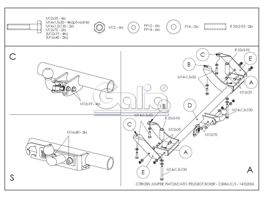 Tažné zařízení Citroen Jumper valník 1994-2006, odnímatelný bajonet, Galia Tažné zařízení Citroen Jumper / Fiat Ducato / Peugeot Boxer Upozornění - k primárnímu používání s nosiči kol doporučujeme volit pevné tažné zařízení. V důsledku dynamického působení svislého zatížení dochází ke snižování životnosti bajonetových systémů. KVALITNÍ TAŽNÉ ZAŘÍZENÍ, KTERÉ NEREZAVÍ, ZA NEJLEPŠÍ CENU Tažné zařízení největšího slovenského výrobce má unikátní povrchovou úpravu zinkováním s 10-ti letou zárukou na ochranu proti korozi. Zinkování vytváří stříbrný povrch, který se po čase vlivem oxidace změní na šedý odstín. Přesnou sériovou výrobou na nejmodernějších strojích je zaručena snadná a rychlá montáž na vozidlo a dobrá cena. Poloautomatický odnímatelný systém se vyznačuje nadstandardní spolehlivostí, jednoduchou obsluhou a kvalitou zpracování a výhodnou cenou. Součástí dodávky je kryt kulového čepu, záslepka a pouzdro čepu po odejmutí. Tažné zařízení je homologováno dle předpisu ECE 55R nebo EU94/20. Výrobce: GALIA Slovakia s.r.o., SlovenskoDoplňkové parametry