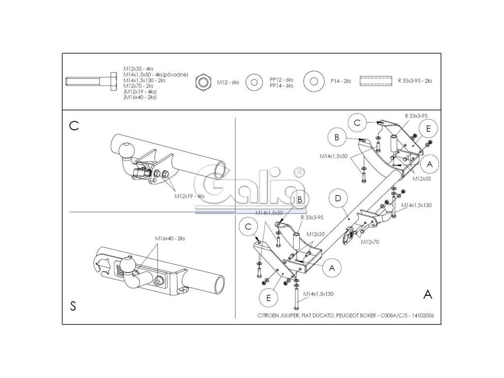 Tažné zařízení Citroen Jumper valník 1994-2006, pevné 2 šr., Galia Tažné zařízení Citroen Jumper / Fiat Ducato / Peugeot Boxer + KVALITNÍ TAŽNÉ ZAŘÍZENÍ, KTERÉ NEREZAVÍ, ZA NEJLEPŠÍ CENU + Tažné zařízení největšího slovenského výrobce má unikátní povrchovou úpravu zinkováním s 10-ti letou zárukou na ochranu proti korozi. Zinkování vytváří stříbrný povrch, který se po čase vlivem oxidace změní na šedý odstín. Přesnou sériovou výrobou na nejmodernějších strojích je zaručena snadná a rychlá montáž na vozidlo a dobrá cena. Tažné zařízení je homologováno dle předpisu ECE 55R nebo EU94/20. Výrobce: GALIA Slovakia s.r.o., SlovenskoDoplňkové parametry