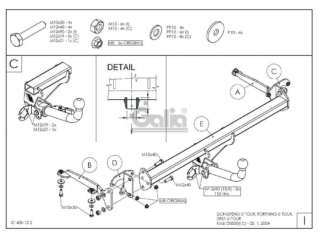 Tažné zařízení Dongfeng U-Tour 22-, pevnéPOZOR! kulový čep překrývá mlhové světlo vozu, při provozu bez přívěsu musí být čep z vozidla demontován. K jeho obsluze je nutné mít ve vozidle příslušné montážní klíče a momentový klíč pro předepsané utažení spojů. Pro tento model vozidla doporučujeme zvolit tažné zařízení s beznářaďovým odnímatelným systémem.