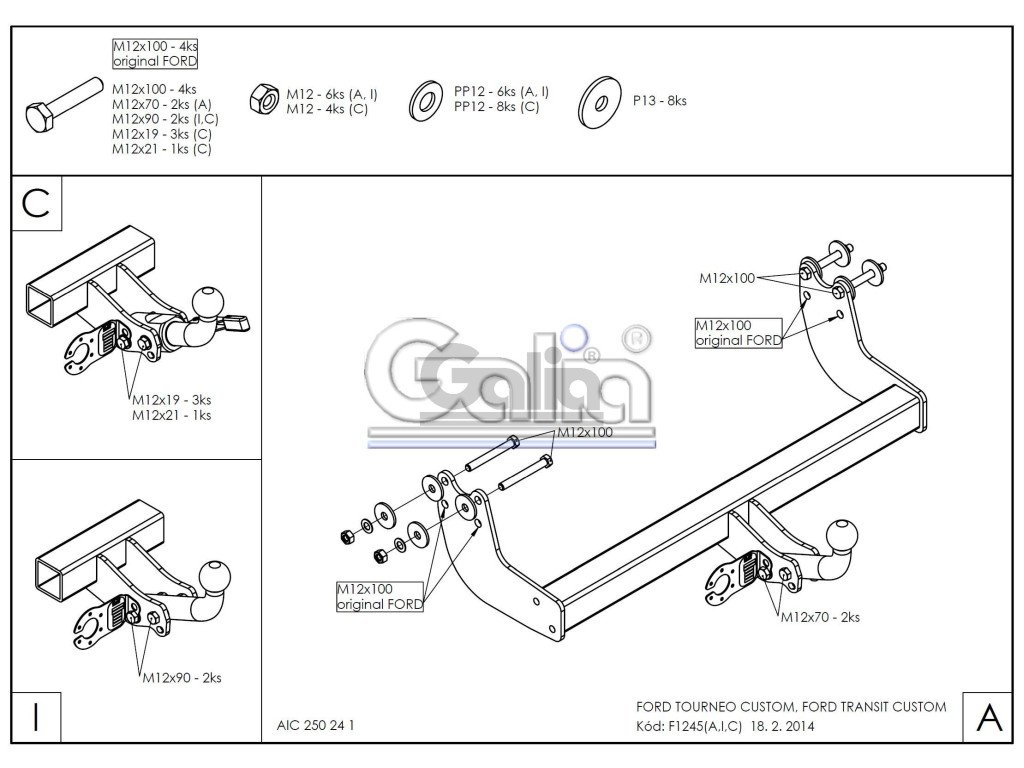 Tažné zařízení Ford Transit Custom + KVALITNÍ TAŽNÉ ZAŘÍZENÍ, KTERÉ NEREZAVÍ, ZA NEJLEPŠÍ CENU + Tažné zařízení největšího slovenského výrobce má unikátní povrchovou úpravu zinkováním s 10-ti letou zárukou na ochranu proti korozi. Zinkování vytváří stříbrný povrch, který se po čase vlivem oxidace změní na šedý odstín. Přesnou sériovou výrobou na nejmodernějších strojích je zaručena snadná a rychlá montáž na vozidlo a dobrá cena. Tažné zařízení je homologováno dle předpisu ECE 55R nebo EU94/20. Výrobce: Gália Slovakia s.r.o., SlovenskoDoplňkové parametry