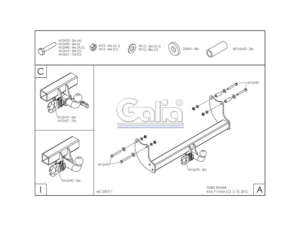 Tažné zařízení Ford Transit/Tourneo valník 2000-2014, pevný čep 2 šrouby, Galia