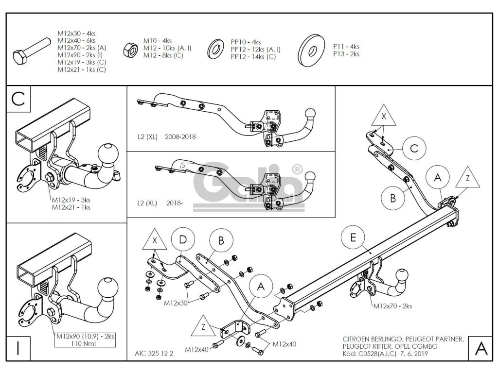 Tažné zařízení Opel Combo L2 (dlouhé) 2018- (E), bajonet, GaliaUpozornění - k primárnímu používání s nosiči kol doporučujeme volit pevné tažné zařízení. V důsledku dynamického působení svislého zatížení dochází ke snižování životnosti bajonetových systémů.