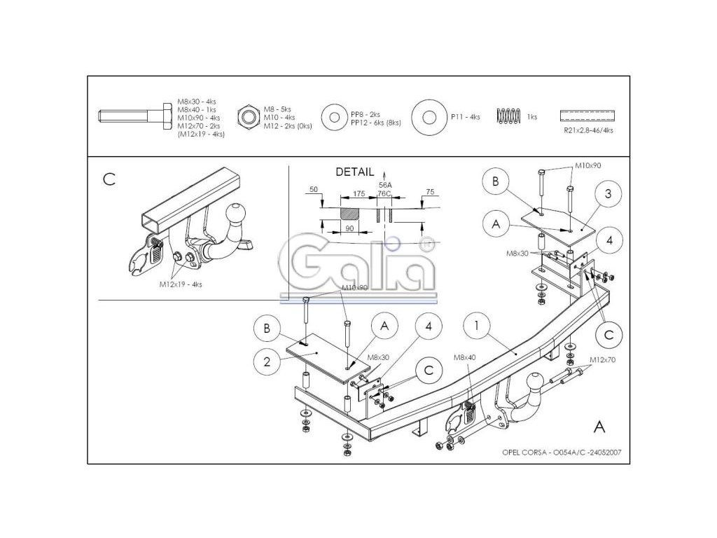 Tažné zařízení Opel Corsa 2000-2006 (C) , pevný čep 2 šrouby, GaliaPOZOR! kulový čep překrývá mlhové světlo vozu, při provozu bez přívěsu musí být čep z vozidla demontován. K jeho obsluze je nutné mít ve vozidle příslušné montážní klíče a momentový klíč pro předepsané utažení spojů. Pro tento model vozidla doporučujeme zvolit tažné zařízení s beznářaďovým odnímatelným systémem.