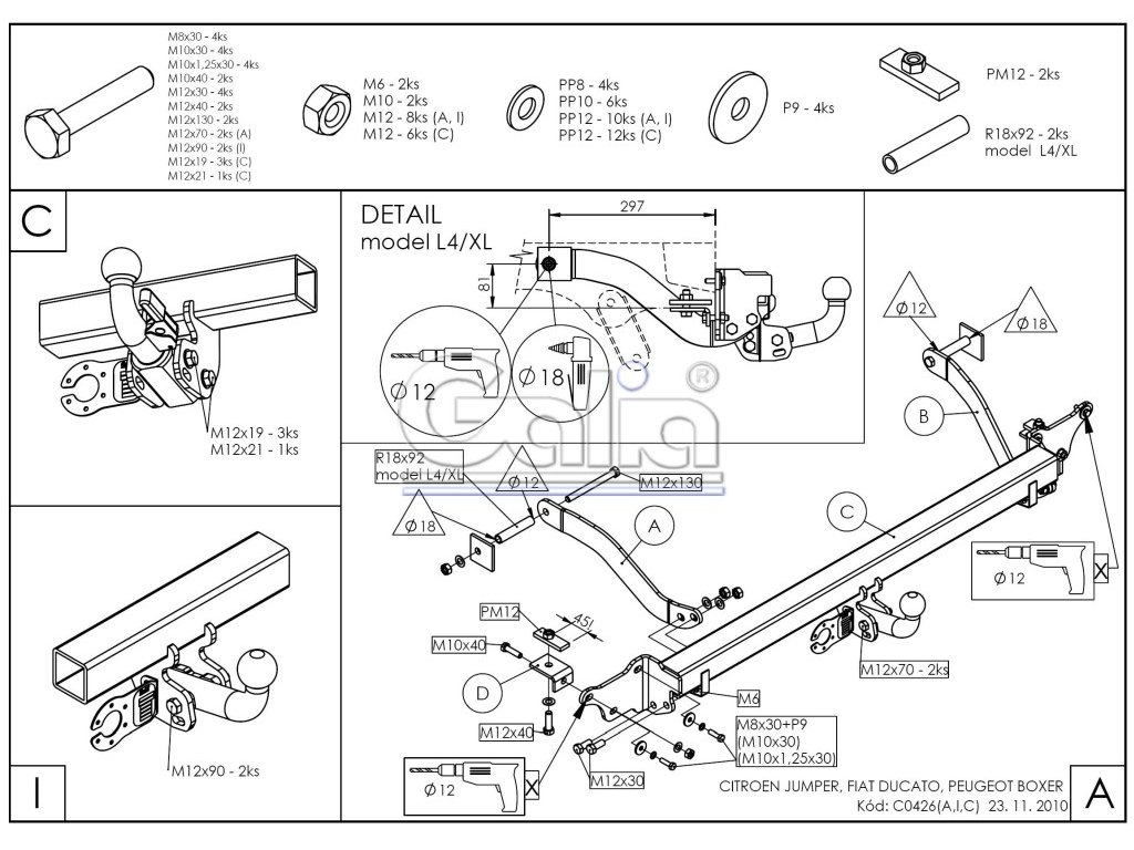 Tažné zařízení Peugeot Boxer skříň 2011-, bajonet, Galia Tažné zařízení Citroen Jumper / Fiat Ducato / Peugeot Boxer + Upozornění - k primárnímu používání s nosiči kol doporučujeme volit pevné tažné zařízení. V důsledku dynamického působení svislého zatížení dochází ke snižování životnosti bajonetových systémů. KVALITNÍ TAŽNÉ ZAŘÍZENÍ, KTERÉ NEREZAVÍ, ZA NEJLEPŠÍ CENU Tažné zařízení největšího slovenského výrobce má unikátní povrchovou úpravu zinkováním s 10-ti letou zárukou na ochranu proti korozi. Zinkování vytváří stříbrný povrch, který se po čase vlivem oxidace změní na šedý odstín. Přesnou sériovou výrobou na nejmodernějších strojích je zaručena snadná a rychlá montáž na vozidlo a dobrá cena. Poloautomatický odnímatelný systém se vyznačuje nadstandardní spolehlivostí, jednoduchou obsluhou a kvalitou zpracování a výhodnou cenou. Součástí dodávky je kryt kulového čepu, záslepka a pouzdro čepu po odejmutí. Tažné zařízení je homologováno dle předpisu ECE 55R nebo EU94/20. Výrobce: GALIA Slovakia s.r.o., SlovenskoDoplňkové parametry