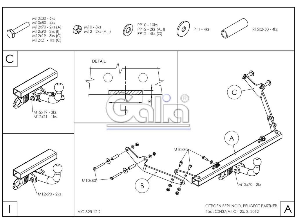 Tažné zařízení Peugeot Partner I (+Origin) 1996- , pevný čep 2 šrouby, Galia