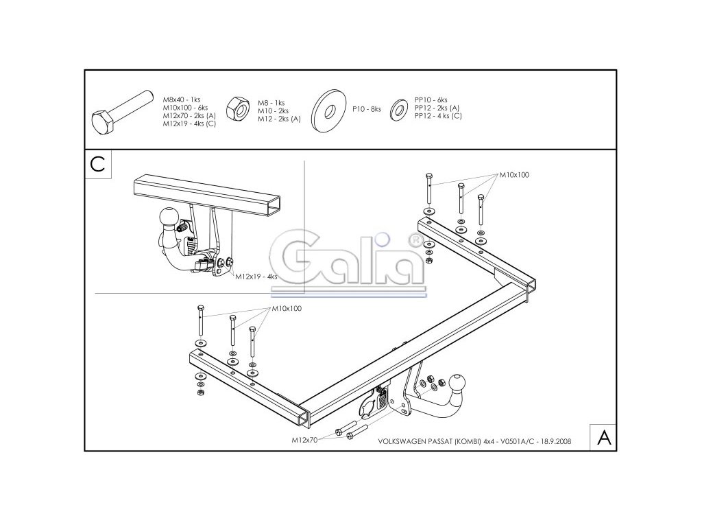 Tažné zařízení VW Passat sedan 1997-2005 (B5 4WD), pevný čep 2 šrouby, Galia Tažné zařízení VW Passat sedan / kombi modely s dvěma tlumiči výfuků, 4 Motion 4WD, V6, W8 + KVALITNÍ TAŽNÉ ZAŘÍZENÍ, KTERÉ NEREZAVÍ, ZA NEJLEPŠÍ CENU + Tažné zařízení největšího slovenského výrobce má unikátní povrchovou úpravu zinkováním s 10-ti letou zárukou na ochranu proti korozi. Zinkování vytváří stříbrný povrch, který se po čase vlivem oxidace změní na šedý odstín. Přesnou sériovou výrobou na nejmodernějších strojích je zaručena snadná a rychlá montáž na vozidlo a dobrá cena. Tažné zařízení je homologováno dle předpisu ECE 55R nebo EU94/20. Výrobce: Gália Slovakia s.r.o., SlovenskoDoplňkové parametry