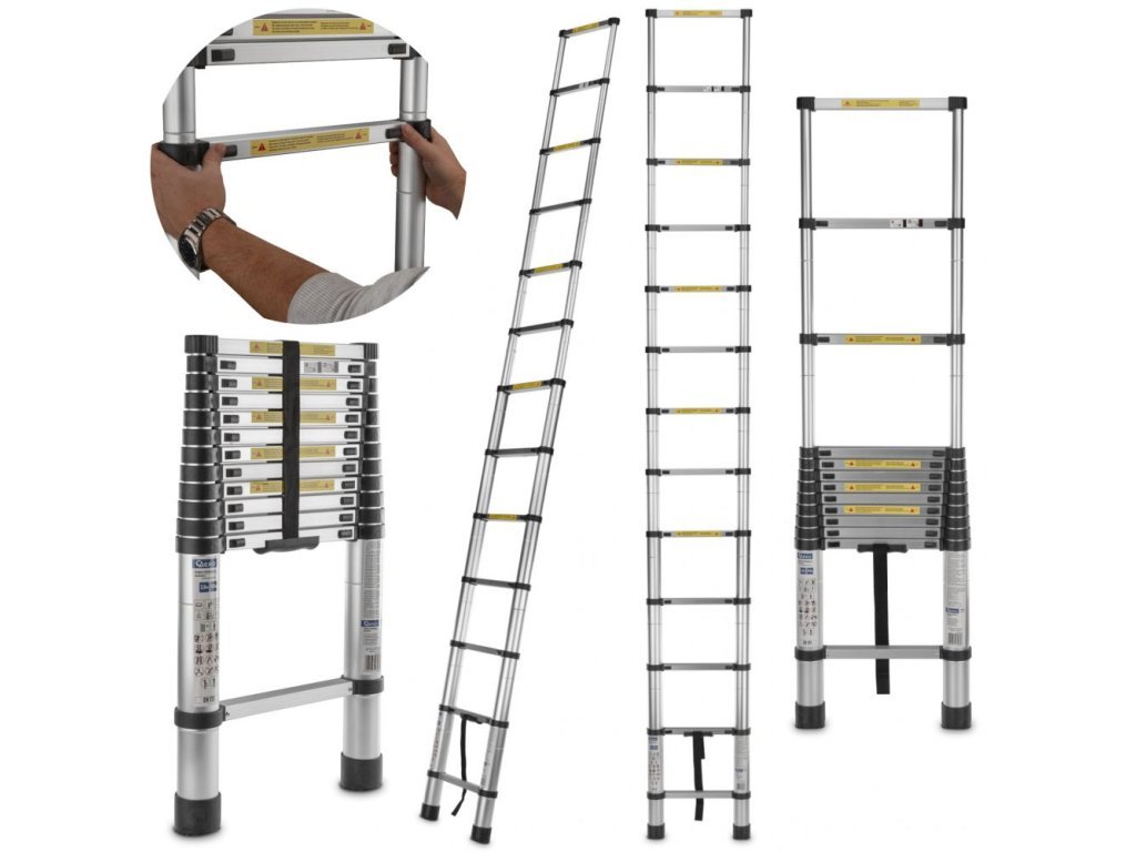 Hliníkový teleskopický žebřík je díky teleskopickému systému velmi oblíbený u většiny řemeslníků, opravářů i majitelů domů a zahrad. Žebřík má ve složeném stavu minimální nároky na prostor, zabere velmi málo místa, manipulace s ním je snadná a pohodlná. Speciální konstrukce a vhodně zvolené materiály zaručují vysokou stabilitu i při plném rozložení žebříku a dovoluje maximální zatížení 150 kg a rozložení do 3,8 m.