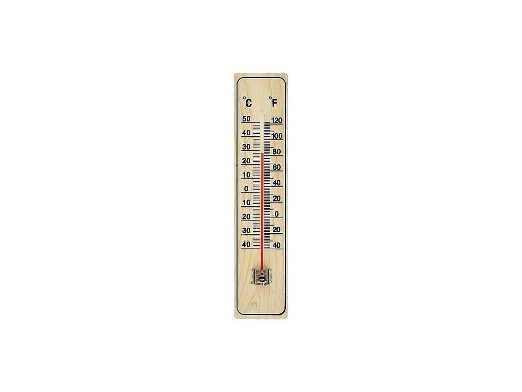 POPISVenkovní teploměr s dřevěným podkladem, měří teplotu v rozsahu od 50 °C do -40 °C.