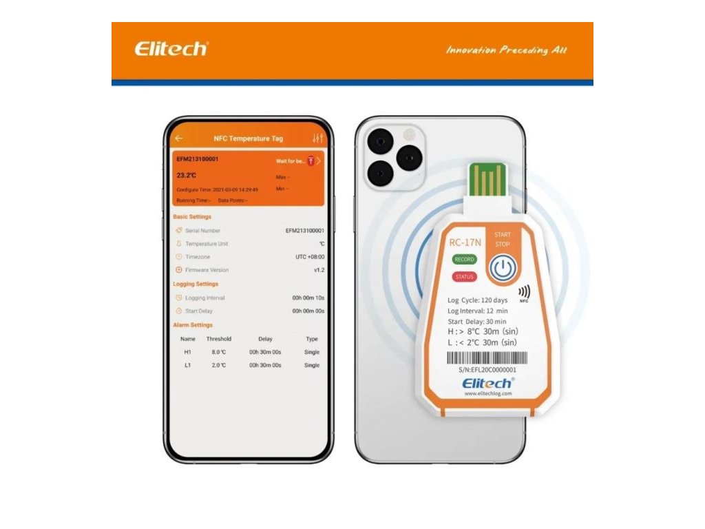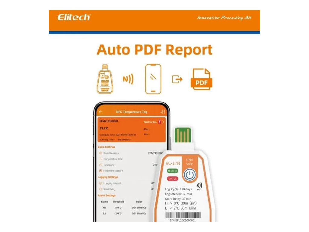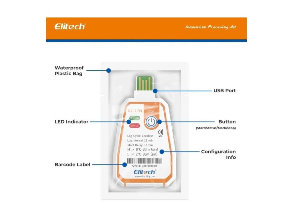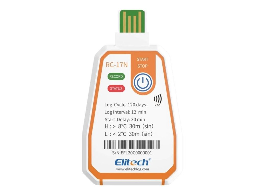 Teploměr Elitech RC-17-N (NFC) - USB Datalogger Jednorázový datalogger RC-17 pro měření teploty například během přepravy (léky, mražené zboží a jiné zásilky. Měří teplotu a vlhkost, kterou zaznamenává do interní paměti. Příjemce balíku datalogger zastaví a připojí jej prostřednictvím USB konektoru do počítače. Datalogger vygeneruje PDF report s naměřenými daty.N verze s bezdrátovou NFC konektivitou. Elitech RC-17-N se dá snadno nasvavit čistáhnout data přes mobilní telefon.