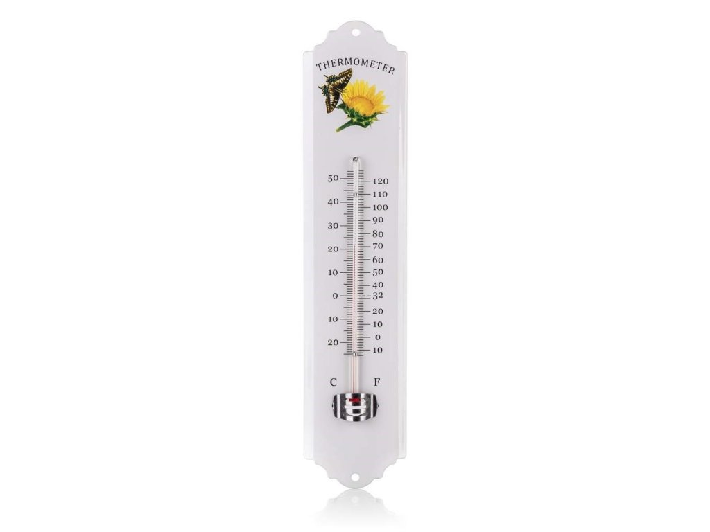 Kovový teploměr s dekorem je vybavený dvěma stupnicemi v rozpětí - 25 až + 54 st. C a -12 až + 124 st. F.Teploměr je opatřen očkem pro zavěšení.