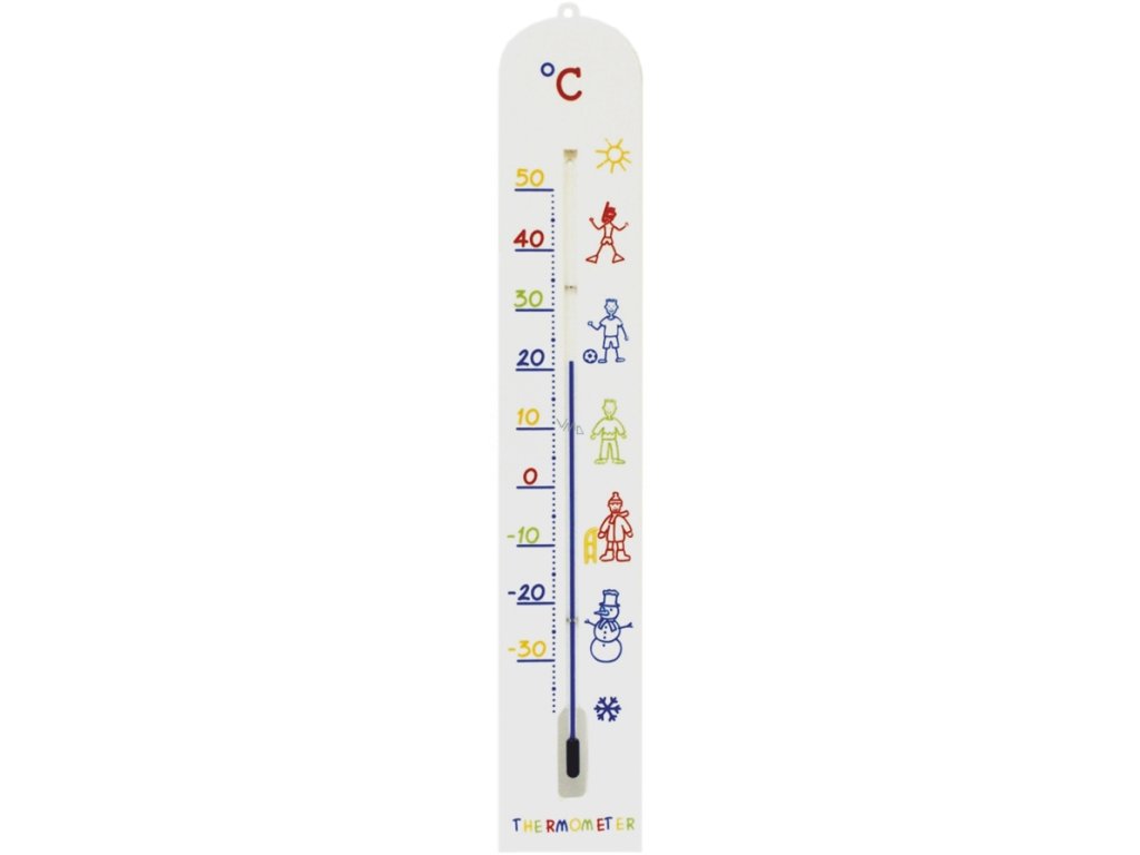 Interierový nebo exteriérový plastový teploměr pro děti s očkem na zavěšení.Rozsah měření -30 až +50°C, rozměry 41 x 6.5 cm.