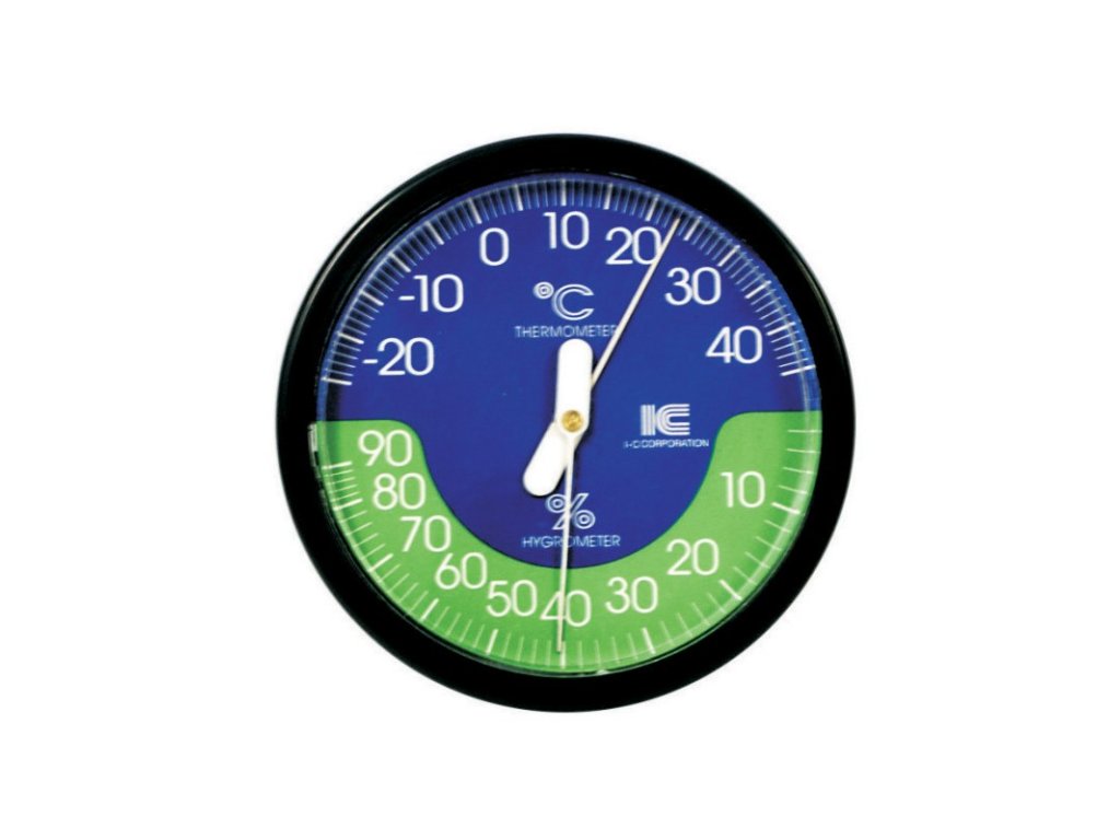 Kulatý teploměr s vlhkoměrem.Vnější průměr 10.8 cm, vlhkoměr měří 0 až 90%, teplotní rozsah -25 až +45°C.