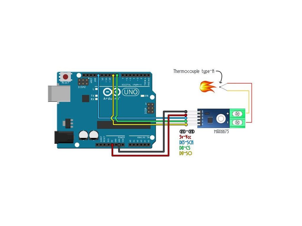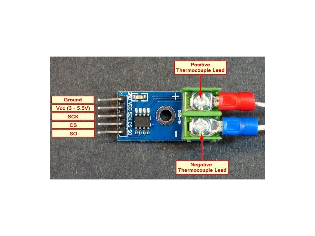 Teplotní sonda 800°C + převodník termočlánku ”K” MAX6675 pro Arduino Arduino modul pro termočlánek ”K” s MAX6675 pro teploty do cca 800°C. MAX6675 je převodník používaný pro termočlánky typu K,J,N,T, nebo E.**Specifikace:**