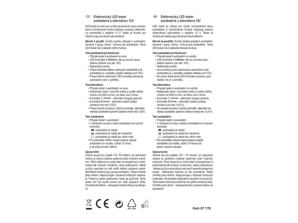 LED tester je určen pro rychlé vyhodnocení stavu autobaterie a vyhodnocení funkce dobíjecí soustavy (alternátoru) automobilů s napětím 12 V. Tester je vhodný pro všechny typy olověných akumulátorů.