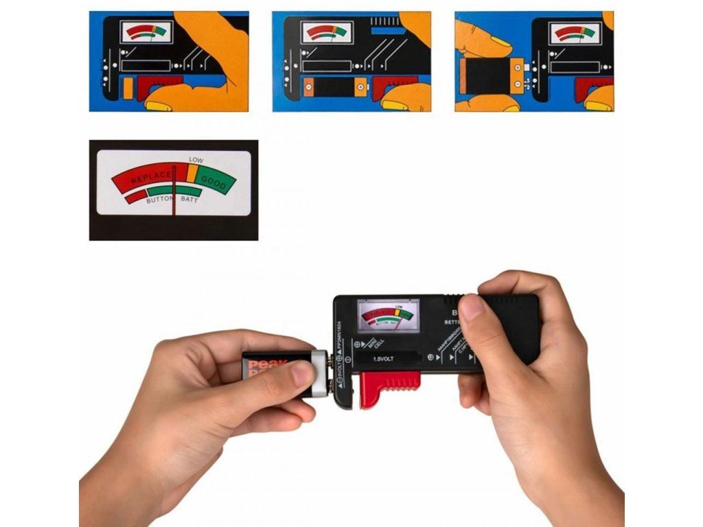 Tester baterií - malé zařízení, které umožňuje velmi jednoduchým a rychlým způsobem zkontrolovat, zda jsou námi používané baterie a akumulátory funkční. Digitální a analogové fotoaparáty vyžadují dobré baterie nebo akumulátory a často si nejsme jisti, zda má naše zařízení dobré napájení nebo zda jsou baterie dobře nabité. Můžete zkontrolovat pomocí tohoto testeru.