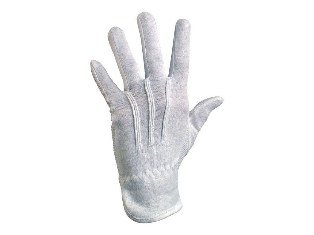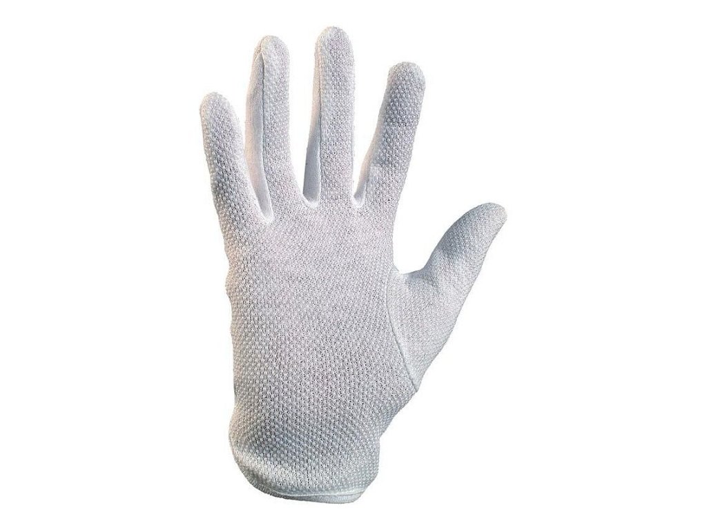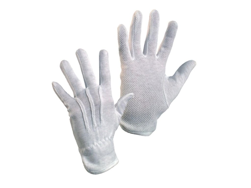 Textilní šité rukavice z běleného bavlněného úpletu, střih fourchette, dlaň a prsty pokryty drobnými PVC terčíky, gumička v zápěstí.