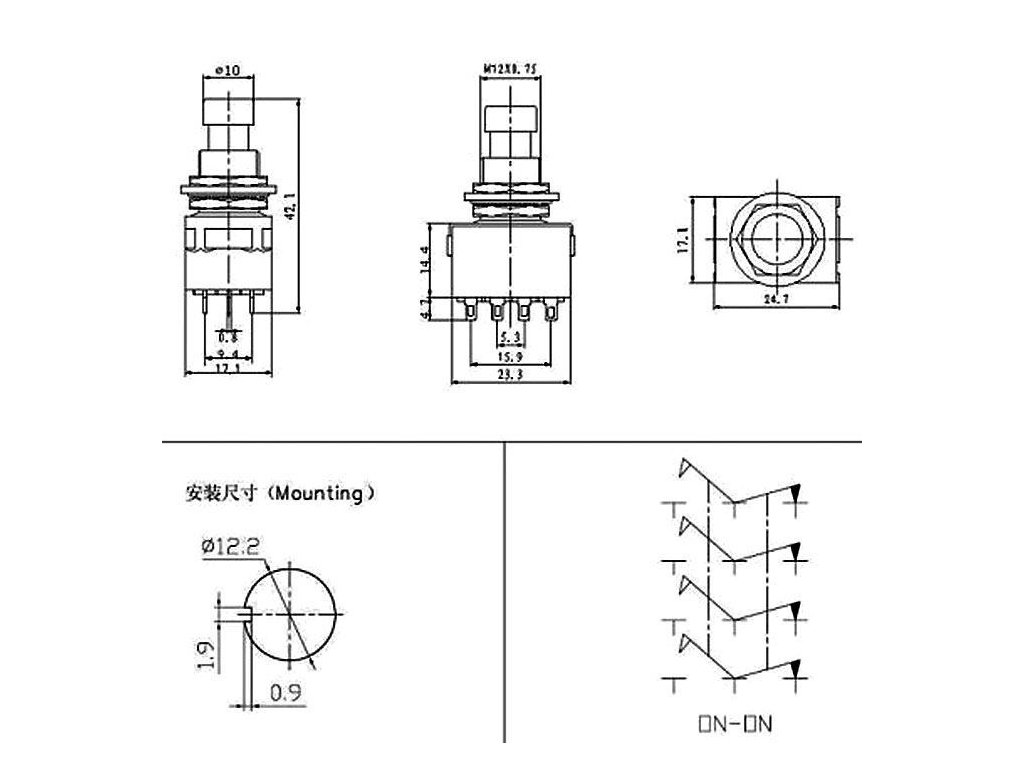 Tlačítko PBS-24-412, ON-(ON) 2pol.250V/2A otvor pr.12mmDoplňkové parametry