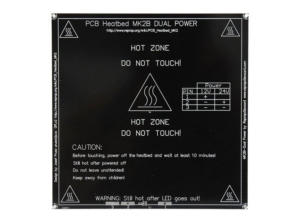 Topná podložka MK2B 214x214x1,5mm 12-24V 120W /3D tisk/ Vyhřívaná podložka je velice důležitou součástí 3D tiskárny. Většinu materiálů bez vyhřívané podložky nelze vytisknout.Rozměry: 214 x 214 x 1,5 mmNapájení: 12V / 24V
