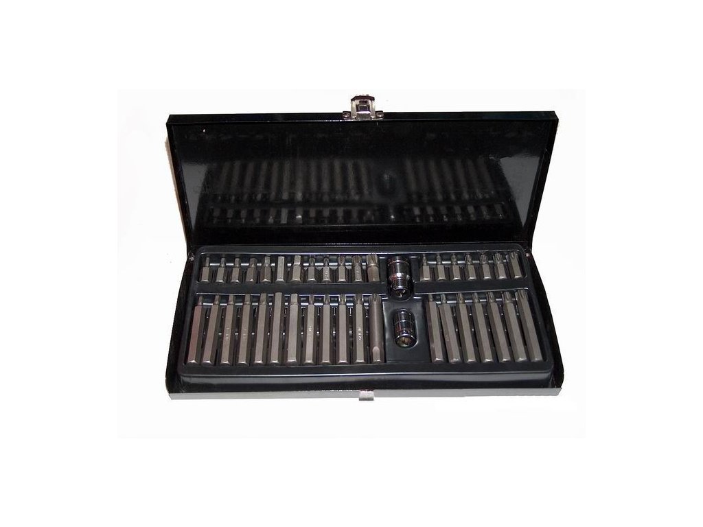 Sada obsahuje nejčastěji používané bity v dílnách, opravnách nebo v průmyslu. Bity jsou vhodné na nástavce pistolových pneumatických šroubováků. Sadu tvoří šestihranné - imbus, Torx a Spline bity a adaptéry 1/2” a 3/8”. Celá sada je uložena v praktickém kovovém kufru. <BR/><BR/><BR/>**Specifikace**<BR/><BR/> obsáhlá sada bitů - šestihranné - imbus, Torx a Spline bity<BR/> adaptéry 1/2” a 3/8”<BR/> praktický kovový kufr<BR/><BR/> <BR/>**Parametry**<BR/><BR/> sada 40ks<BR/> dlouhé (75 mm) a krátké (30 mm) bity:<BR/> IMBUS klíče: 4, 5, 6, 7, 8, 10, 12 mm<BR/> TORX klíče: T-20, T-25, T-30, T-40, T-45, T-50, T-55<BR/> XZN Spline: M5, M6, M8, M10 a M12 mm<BR/>Doplňkové parametry