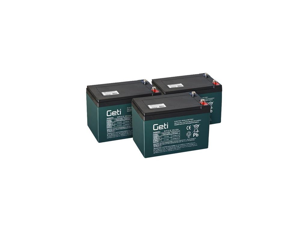 Sada bezúdržbových akumulátorů GETI 36V 12Ah (3x12V) určená pro pohon elektromotoru.