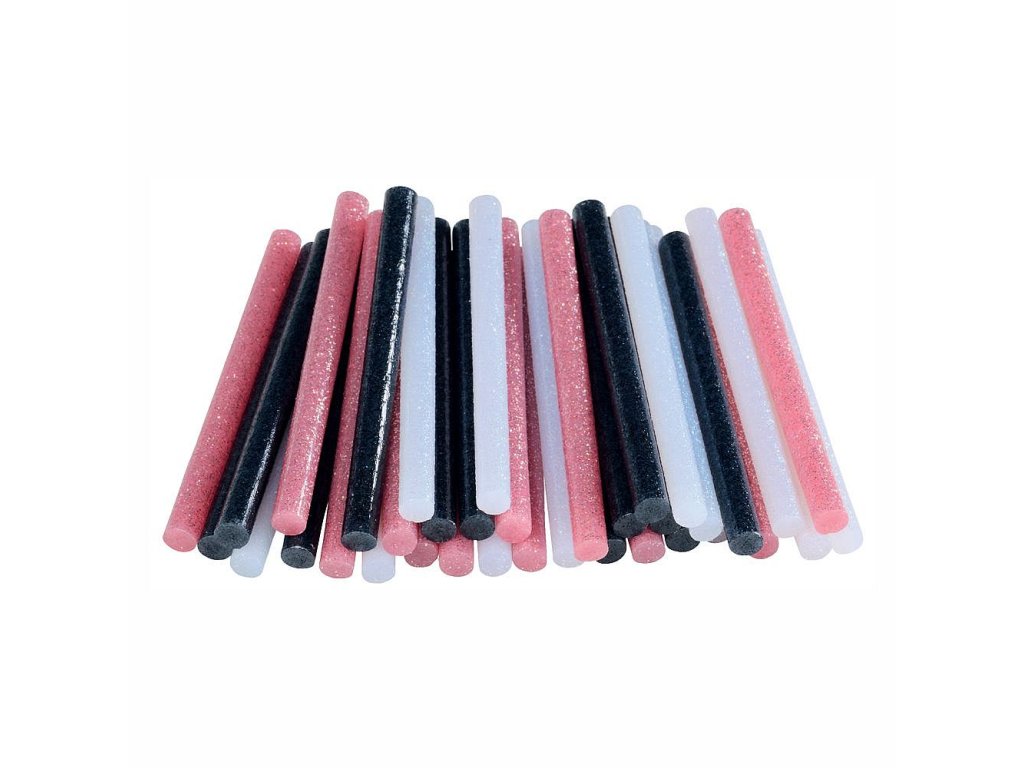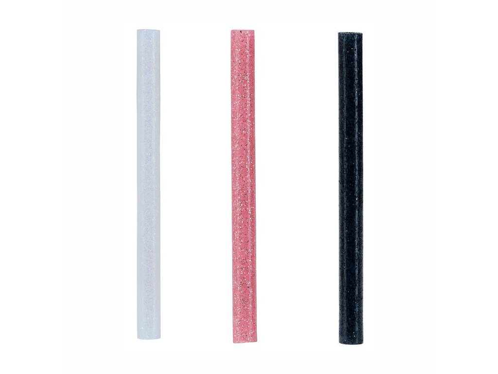 Lepící tyčinky se dodávají ve třpytivé bílé, růžové a černé barvě.