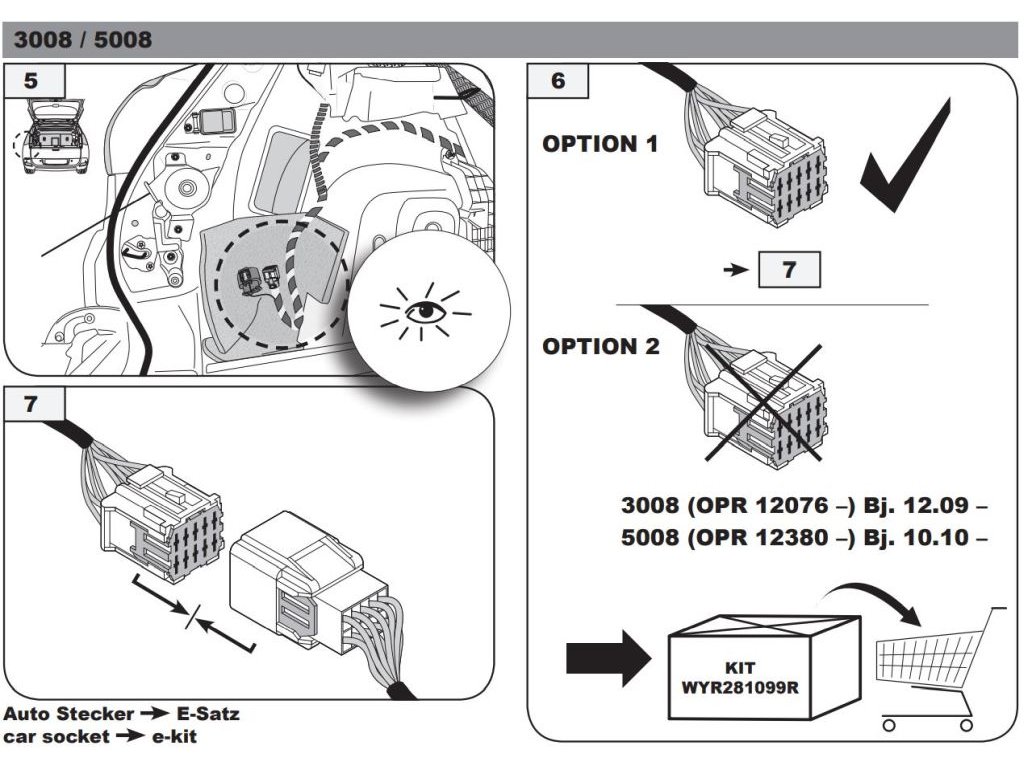 Typová elektropřípojka Peugeot 3008 2009-2016 , 7pin, TowTec281007 Typová 7mi pinová elektrosada výrobce TowTec s bezkonkurenční cenou a perfektní spolehlivostí.Typové elektropřípojky se běžně zapojují do předem připravených konektorů na vozidle a po nakódování komunikují s elektronickými systémy vozidla. Zda přípojka komunikuje po datové sběrnici, zda obsluhuje kontrolu prasklých žárovek, nebo zda je nutné programování vozu pro její správnou funkčnost, je patrné z jejích parametrů (CAN-Bus, Check Control, Kódování...). Typové přípojky rovněž ve většině případů odpojují originální parkovací senzory (viz parametr Odpojení PDC).