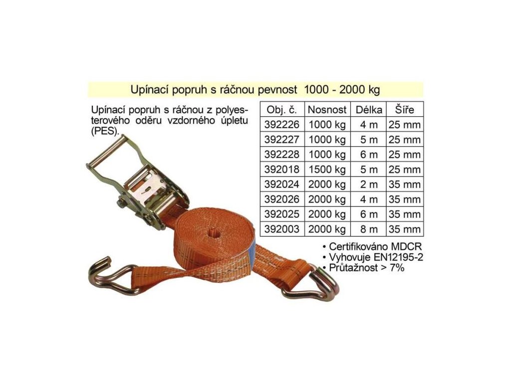 Upínací popruh-kurta 6m s háky a ráčnou, pevnost 1000kg šířka 25mmDoplňkové parametry