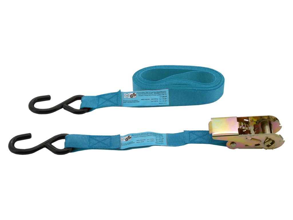 Upínací popruhy s celokovovým ráčnovým mechanismem mají šířku popruhu 25 mm a délku 5m. Zakončení popruhů je řešeno kovovými háky s plastovým povrchem, v sadě jsou dva páry těchto upínačů s tažnou sílou 250daN.