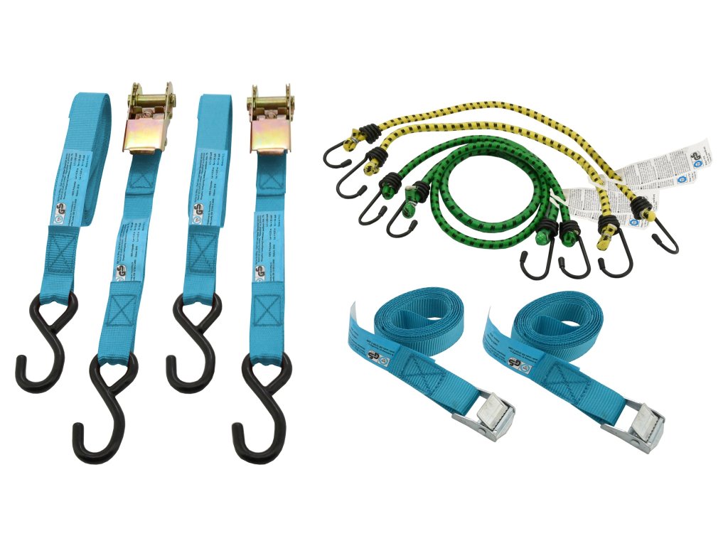 Univerzální sada upínacích popruhů a pružných upínačů s homologací TÜV/GS, k zajištění předmětů, zavazadel, nebo nákladu.