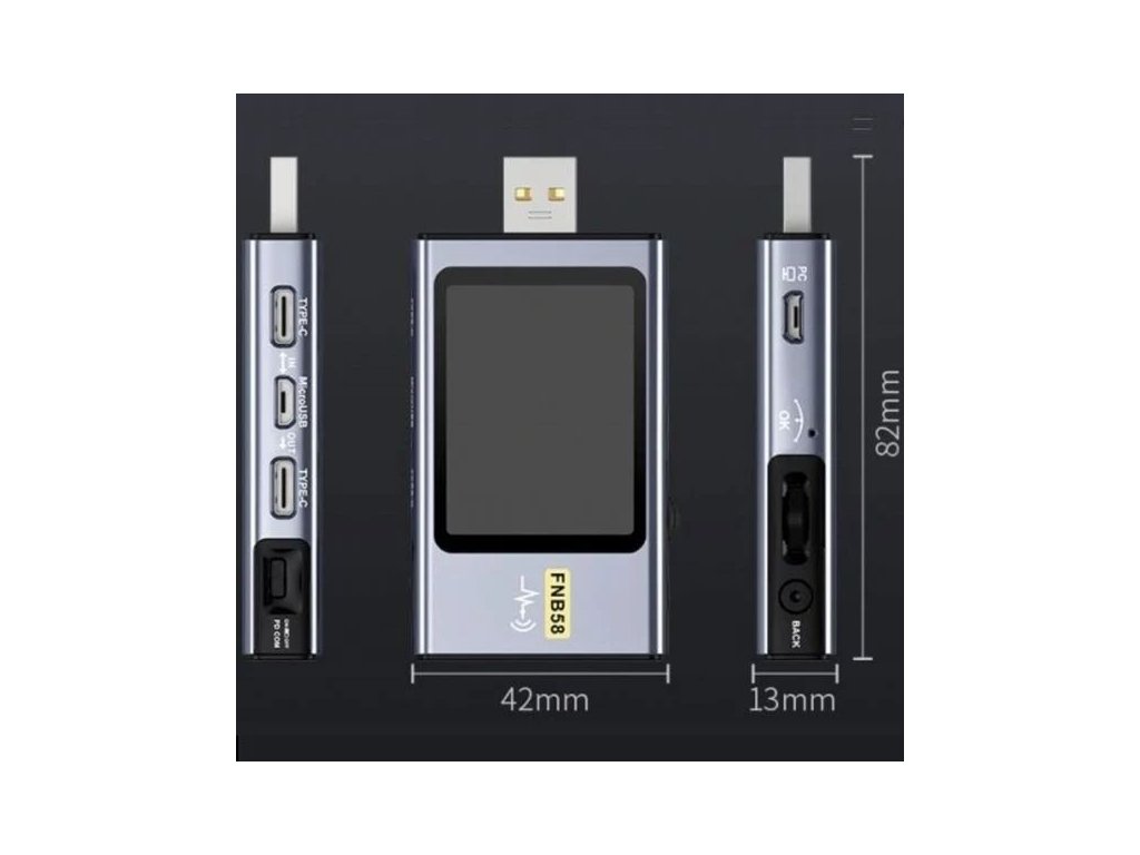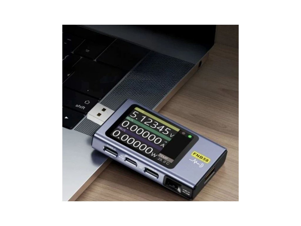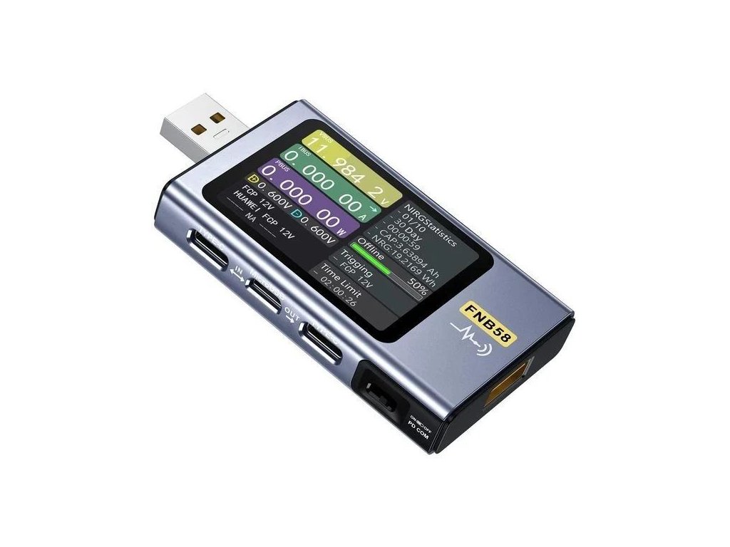 USB tester FNIRSI FNB58 USB tester FNIRSI FNB58 je multifunkční nástroj pro testování a monitorování USB napájecích portů.S tímto testerem lze snadno zjistit napětí, proud a výkon, kterým měřený USB port dodává energii.Je ideální pro diagnostiku a opravu USB portů na různých zařízeních, jako jsou notebooky, tablety, mobilní telefony a další.