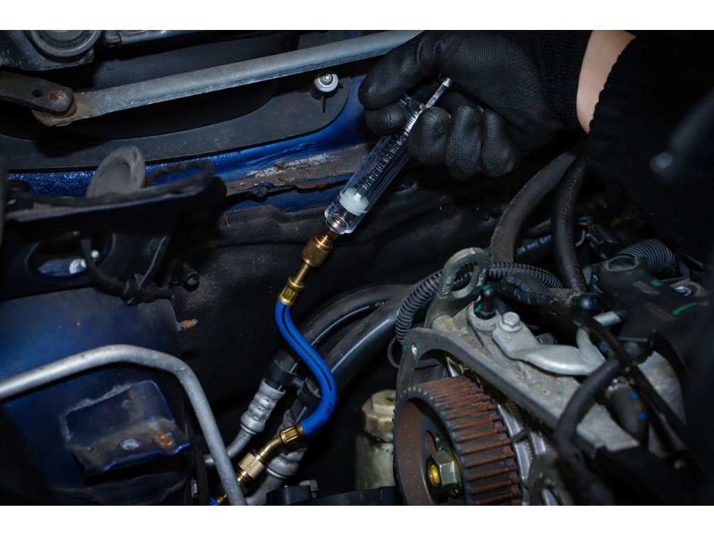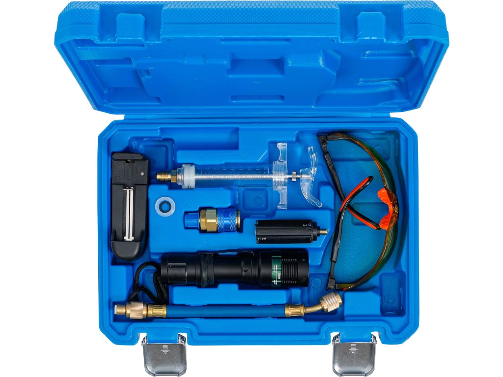 Sada UV lampy pro detekci netěsností nebo úniků u klimatizace s chladicím médiem R134a.