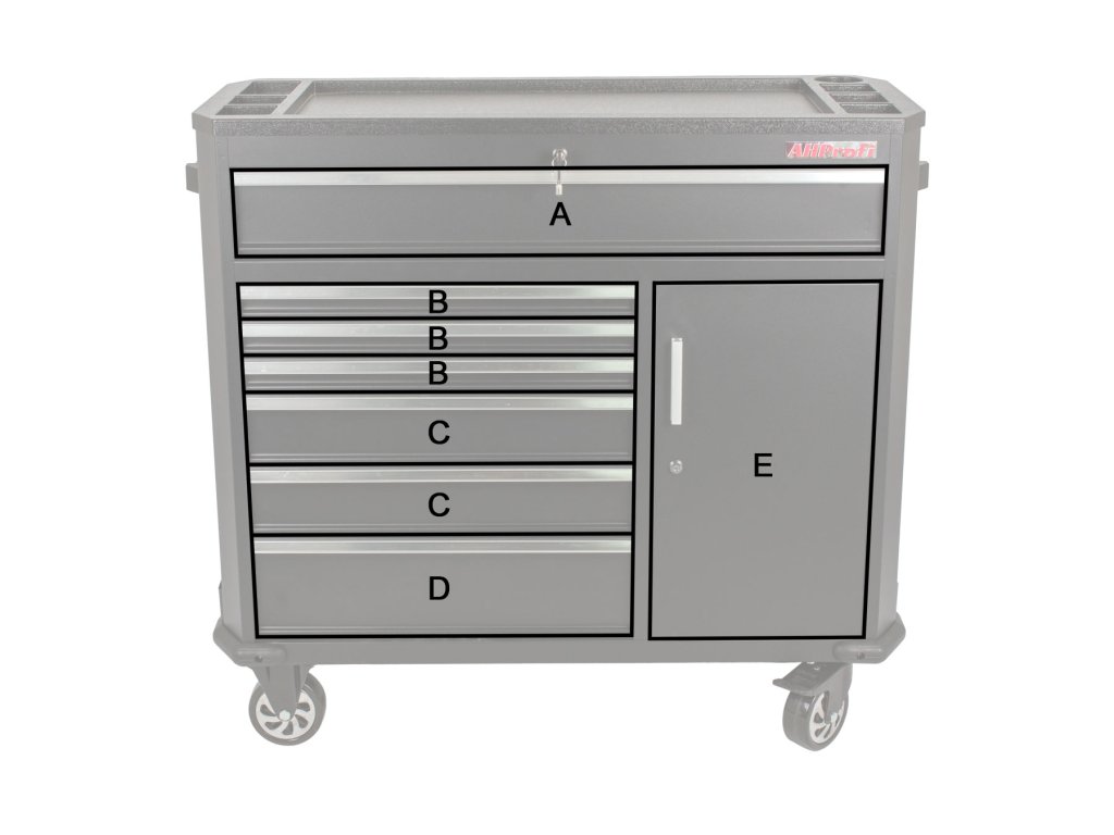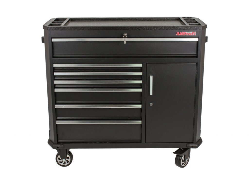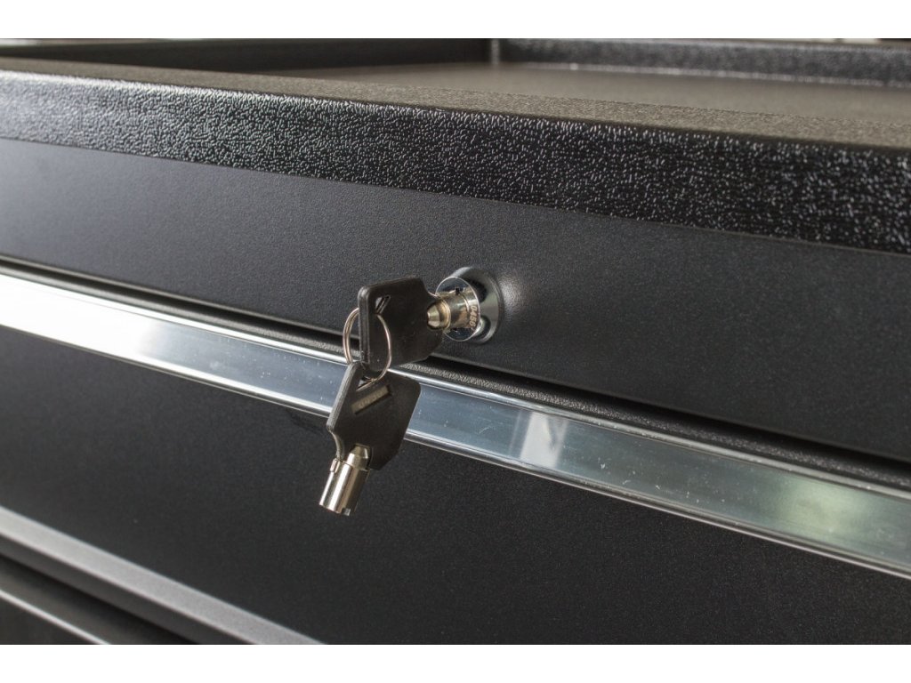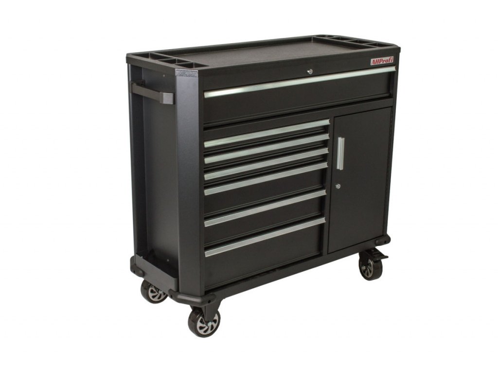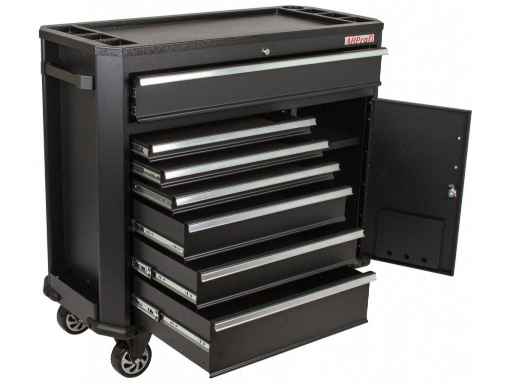 Černá pojízdná skříňka s celkovými rozměry (Š x V x H) 1091 x 1027 x 470 mm. Vozík je vybavený 7 šuplíky s různými rozměry. Dále má skříňku, ve které je nastavitelná polička a na bocích skříňky jsou úložné systémy. Všechny úložné prostory jsou zamykatelné.