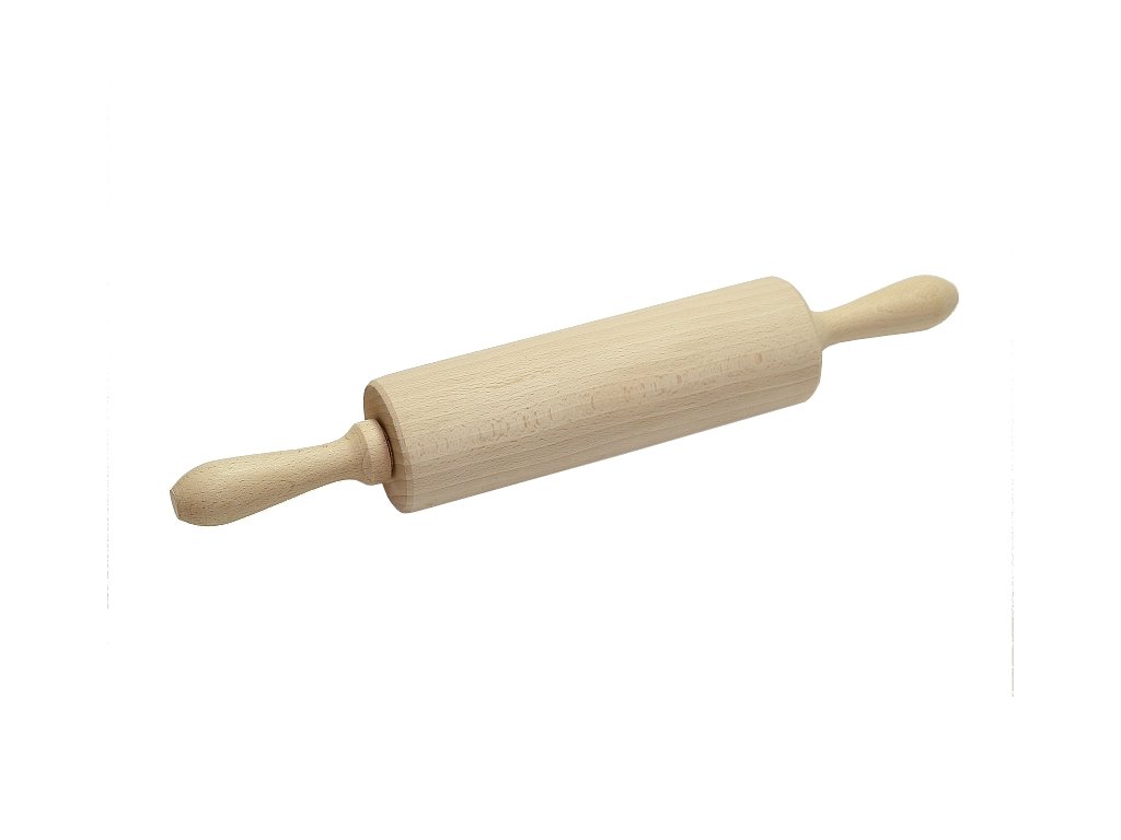 Váleček na těsto s kovovou osou vyrobený z bukového dřeva.Šířka pracovní plochy je 210 mm, průměr válečku je 60 mm, celková šířka 400 mm.
