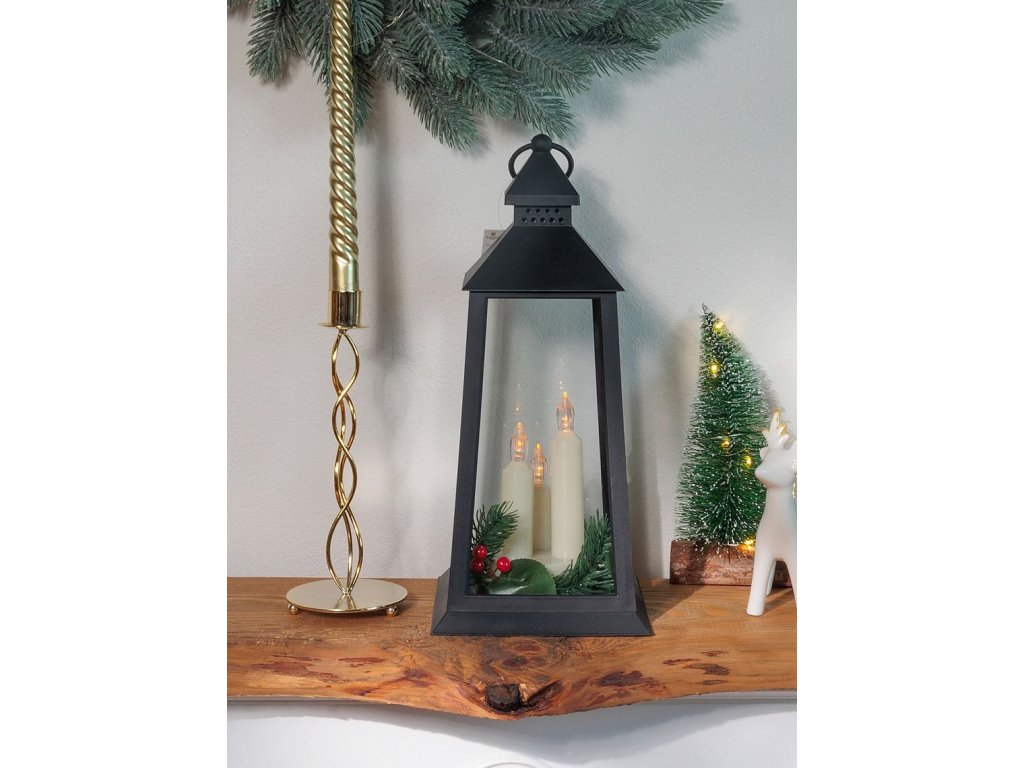 Vánoční lucerna MagicHome v elegantním černém provedení s imitací svíček je krásným doplňkem,