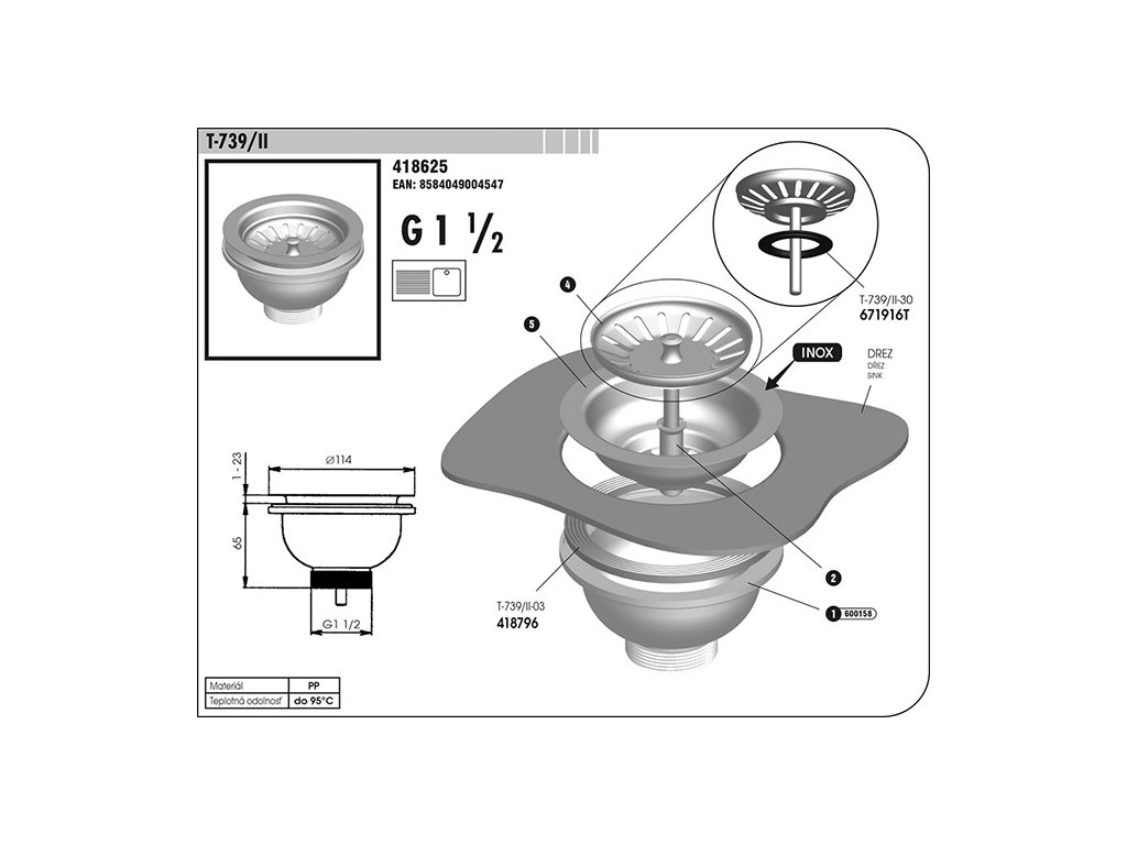 Připojovací závit G 1 1/2".Plastový vypouštěcí ventil s nerezovou miskou.
