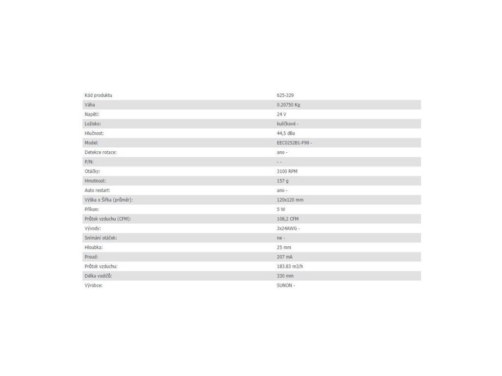 Ventilátor 120x120x25mm SUNON 24V/0,207A/ 5W VAPO MagLev 3100ot./min. 108CFM=183,83m3/h 44,5dBa, hmotnost 162gDoplňkové parametry
