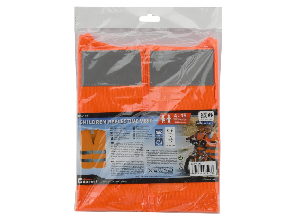 Výstražná reflexní vesta pro děti se zapínáním na suchý zip. Dva reflexní pruhy po celém obvodu, oranžová barva. Určeno pro děti ve věku 4 - 15 let.